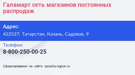 Галамарт, сеть магазинов постоянных распродаж по адресу 422527, Татарстан, Казань, Садовая, 9 в дальнейшем Организация, размещена в следующих категориях: