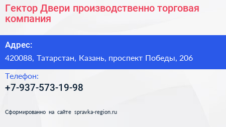 Гектор Двери, производственно-торговая компания по адресу 420088, Татарстан, Казань, проспект Победы, 206 в дальнейшем Организация, размещена в следующих категориях: