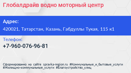 Глобалдрайв, водно-моторный центр по адресу 420021, Татарстан, Казань, Габдуллы Тукая, 115 к1 в дальнейшем Организация, размещена в следующих категориях: