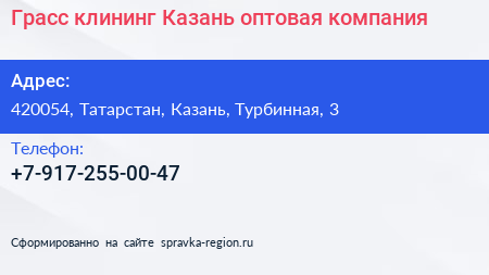 Грасс клининг Казань, оптовая компания по адресу 420054, Татарстан, Казань, Турбинная, 3 в дальнейшем Организация, размещена в следующих категориях: