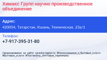 Химакс Групп, научно-производственное объединение по адресу 420054, Татарстан, Казань, Техническая, 23а/1 в дальнейшем Организация, размещена в следующих категориях: