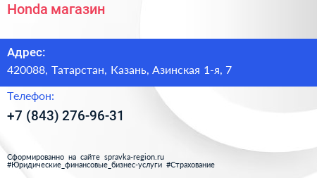 Honda, магазин по адресу 420088, Татарстан, Казань, Азинская 1-я, 7 в дальнейшем Организация, размещена в следующих категориях: