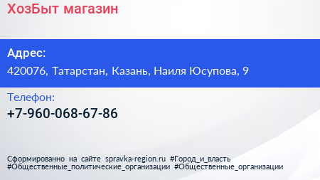 ХозБыт, магазин по адресу 420076, Татарстан, Казань, Наиля Юсупова, 9 в дальнейшем Организация, размещена в следующих категориях: