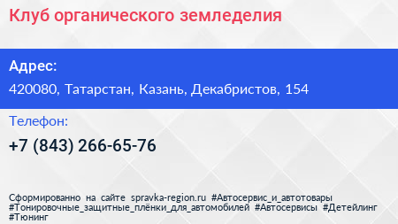 Клуб органического земледелия по адресу 420080, Татарстан, Казань, Декабристов, 154 в дальнейшем Организация, размещена в следующих категориях: