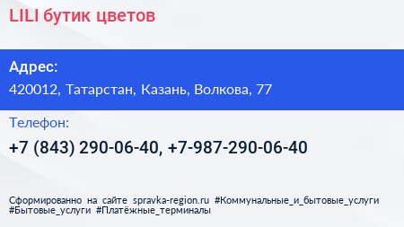 LILI, бутик цветов по адресу 420012, Татарстан, Казань, Волкова, 77 в дальнейшем Организация, размещена в следующих категориях: