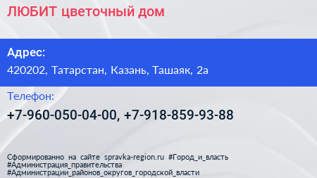 ЛЮБИТ, цветочный дом по адресу 420202, Татарстан, Казань, Ташаяк, 2а в дальнейшем Организация, размещена в следующих категориях: