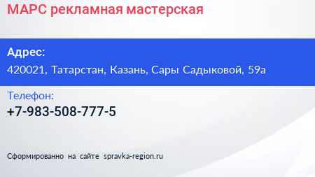 МАРС, рекламная мастерская по адресу 420021, Татарстан, Казань, Сары Садыковой, 59а в дальнейшем Организация, размещена в следующих категориях: