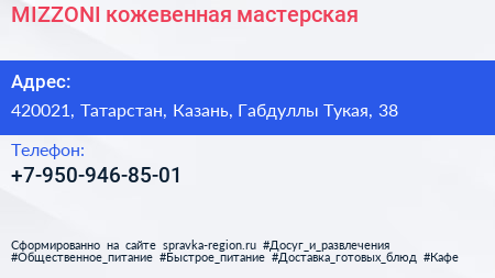 MIZZONI, кожевенная мастерская по адресу 420021, Татарстан, Казань, Габдуллы Тукая, 38 в дальнейшем Организация, размещена в следующих категориях: