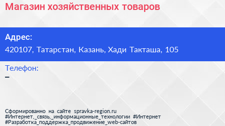Магазин хозяйственных товаров по адресу 420107, Татарстан, Казань, Хади Такташа, 105 в дальнейшем Организация, размещена в следующих категориях: