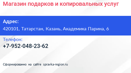 Магазин подарков и копировальных услуг по адресу 420101, Татарстан, Казань, Академика Парина, 6 в дальнейшем Организация, размещена в следующих категориях: