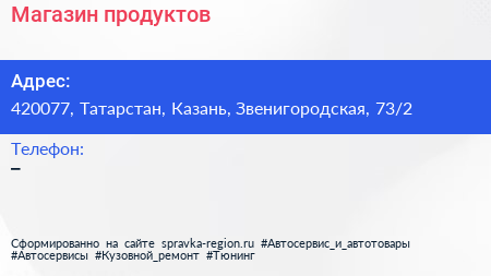Магазин продуктов по адресу 420077, Татарстан, Казань, Звенигородская, 73/2 в дальнейшем Организация, размещена в следующих категориях: