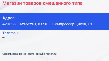 Магазин товаров смешанного типа по адресу 420056, Татарстан, Казань, Компрессорщиков, 61 в дальнейшем Организация, размещена в следующих категориях: