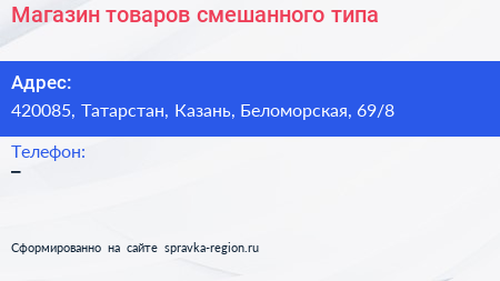 Магазин товаров смешанного типа по адресу 420085, Татарстан, Казань, Беломорская, 69/8 в дальнейшем Организация, размещена в следующих категориях: