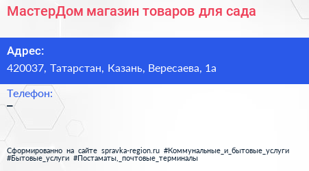 МастерДом, магазин товаров для сада по адресу 420037, Татарстан, Казань, Вересаева, 1а в дальнейшем Организация, размещена в следующих категориях: