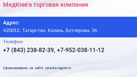 МедКнига, торговая компания по адресу 420012, Татарстан, Казань, Бутлерова, 36 в дальнейшем Организация, размещена в следующих категориях: