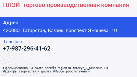 ПЛЭЙ+, торгово-производственная компания по адресу 420080, Татарстан, Казань, проспект Ямашева, 10 в дальнейшем Организация, размещена в следующих категориях:
