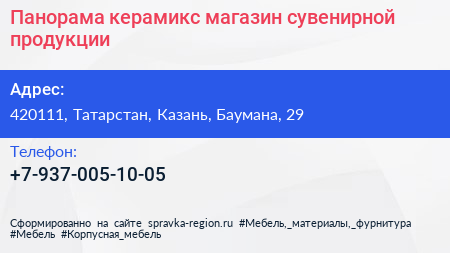 Панорама керамикс, магазин сувенирной продукции по адресу 420111, Татарстан, Казань, Баумана, 29 в дальнейшем Организация, размещена в следующих категориях:
