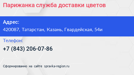 Парижанка, служба доставки цветов по адресу 420087, Татарстан, Казань, Гвардейская, 54и в дальнейшем Организация, размещена в следующих категориях:
