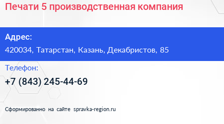 Печати 5, производственная компания по адресу 420034, Татарстан, Казань, Декабристов, 85 в дальнейшем Организация, размещена в следующих категориях: