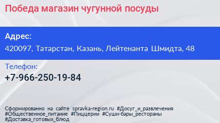 Победа, магазин чугунной посуды по адресу 420097, Татарстан, Казань, Лейтенанта Шмидта, 48 в дальнейшем Организация, размещена в следующих категориях: