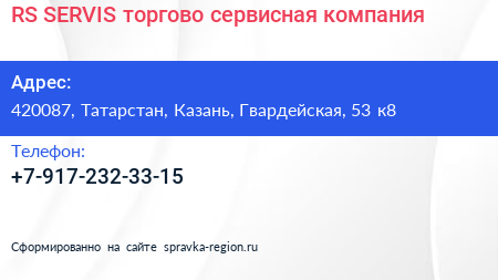 RS-SERVIS, торгово-сервисная компания по адресу 420087, Татарстан, Казань, Гвардейская, 53 к8 в дальнейшем Организация, размещена в следующих категориях: