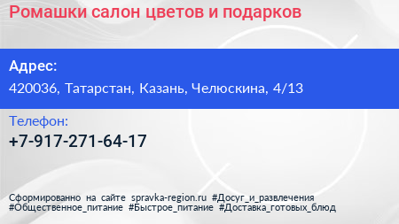 Ромашки, салон цветов и подарков по адресу 420036, Татарстан, Казань, Челюскина, 4/13 в дальнейшем Организация, размещена в следующих категориях: