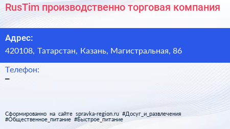 RusTim, производственно-торговая компания по адресу 420108, Татарстан, Казань, Магистральная, 86 в дальнейшем Организация, размещена в следующих категориях: