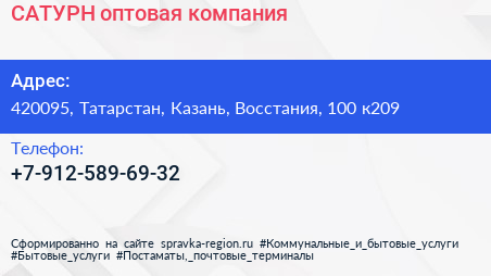 САТУРН, оптовая компания по адресу 420095, Татарстан, Казань, Восстания, 100 к209 в дальнейшем Организация, размещена в следующих категориях: