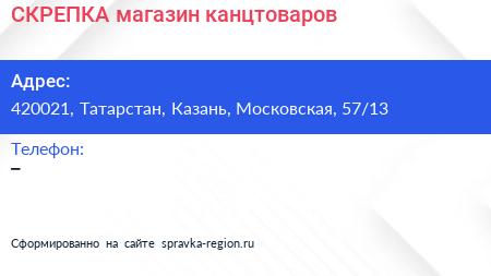 СКРЕПКА, магазин канцтоваров по адресу 420021, Татарстан, Казань, Московская, 57/13 в дальнейшем Организация, размещена в следующих категориях: