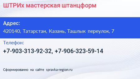 ШТРИх, мастерская штанцформ по адресу 420140, Татарстан, Казань, Ташлык переулок, 7 в дальнейшем Организация, размещена в следующих категориях: