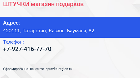ШТУЧКИ, магазин подарков по адресу 420111, Татарстан, Казань, Баумана, 82 в дальнейшем Организация, размещена в следующих категориях: