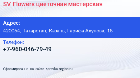SV Flowers, цветочная мастерская по адресу 420064, Татарстан, Казань, Гарифа Ахунова, 18 в дальнейшем Организация, размещена в следующих категориях: