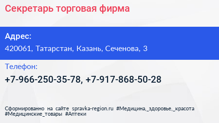 Секретарь, торговая фирма по адресу 420061, Татарстан, Казань, Сеченова, 3 в дальнейшем Организация, размещена в следующих категориях: