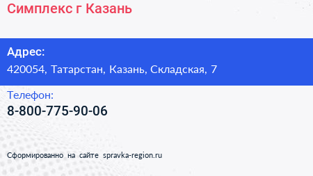Симплекс, г. Казань по адресу 420054, Татарстан, Казань, Складская, 7 в дальнейшем Организация, размещена в следующих категориях: