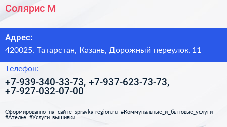 Солярис - М по адресу 420025, Татарстан, Казань, Дорожный переулок, 11 в дальнейшем Организация, размещена в следующих категориях:
