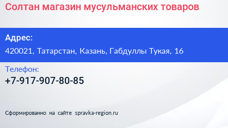 Солтан, магазин мусульманских товаров по адресу 420021, Татарстан, Казань, Габдуллы Тукая, 16 в дальнейшем Организация, размещена в следующих категориях: