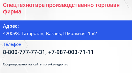 Спецтехнотара, производственно-торговая фирма по адресу 420098, Татарстан, Казань, Школьная, 1 к2 в дальнейшем Организация, размещена в следующих категориях: