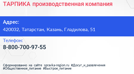 ТАРПИКА, производственная компания по адресу 420032, Татарстан, Казань, Гладилова, 51 в дальнейшем Организация, размещена в следующих категориях: