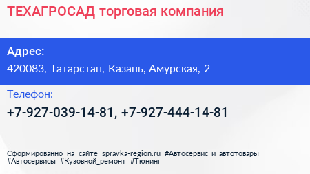 ТЕХАГРОСАД, торговая компания по адресу 420083, Татарстан, Казань, Амурская, 2 в дальнейшем Организация, размещена в следующих категориях: