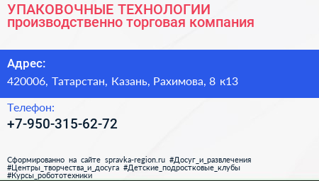 УПАКОВОЧНЫЕ ТЕХНОЛОГИИ, производственно-торговая компания по адресу 420006, Татарстан, Казань, Рахимова, 8 к13 в дальнейшем Организация, размещена в следующих категориях: