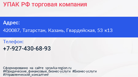 УПАК.РФ, торговая компания по адресу 420087, Татарстан, Казань, Гвардейская, 53 к13 в дальнейшем Организация, размещена в следующих категориях: