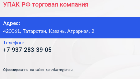 УПАК.РФ, торговая компания по адресу 420061, Татарстан, Казань, Аграрная, 2 в дальнейшем Организация, размещена в следующих категориях:
