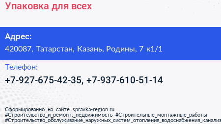 Упаковка для всех по адресу 420087, Татарстан, Казань, Родины, 7 к1/1 в дальнейшем Организация, размещена в следующих категориях:
