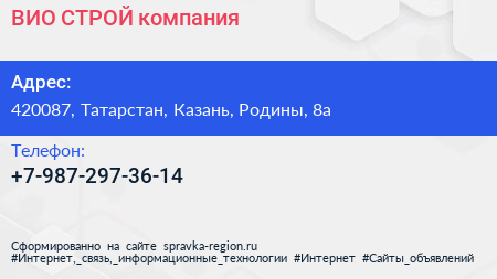 ВИО СТРОЙ, компания по адресу 420087, Татарстан, Казань, Родины, 8а в дальнейшем Организация, размещена в следующих категориях: