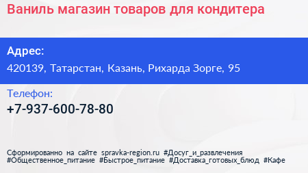 Ваниль, магазин товаров для кондитера по адресу 420139, Татарстан, Казань, Рихарда Зорге, 95 в дальнейшем Организация, размещена в следующих категориях: