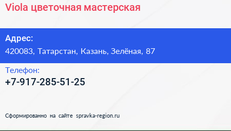 Viola, цветочная мастерская по адресу 420083, Татарстан, Казань, Зелёная, 87 в дальнейшем Организация, размещена в следующих категориях: