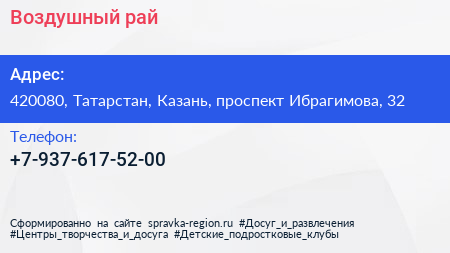 Воздушный рай по адресу 420080, Татарстан, Казань, проспект Ибрагимова, 32 в дальнейшем Организация, размещена в следующих категориях: