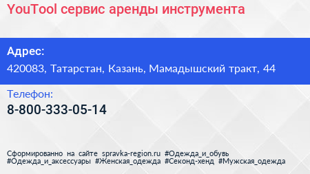 YouTool, сервис аренды инструмента по адресу 420083, Татарстан, Казань, Мамадышский тракт, 44 в дальнейшем Организация, размещена в следующих категориях: