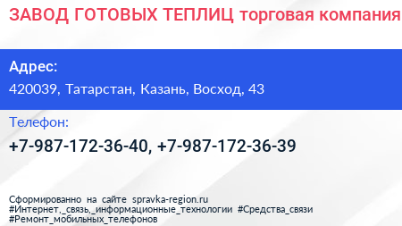 ЗАВОД ГОТОВЫХ ТЕПЛИЦ, торговая компания по адресу 420039, Татарстан, Казань, Восход, 43 в дальнейшем Организация, размещена в следующих категориях: