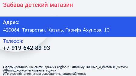Забава, детский магазин по адресу 420064, Татарстан, Казань, Гарифа Ахунова, 10 в дальнейшем Организация, размещена в следующих категориях: